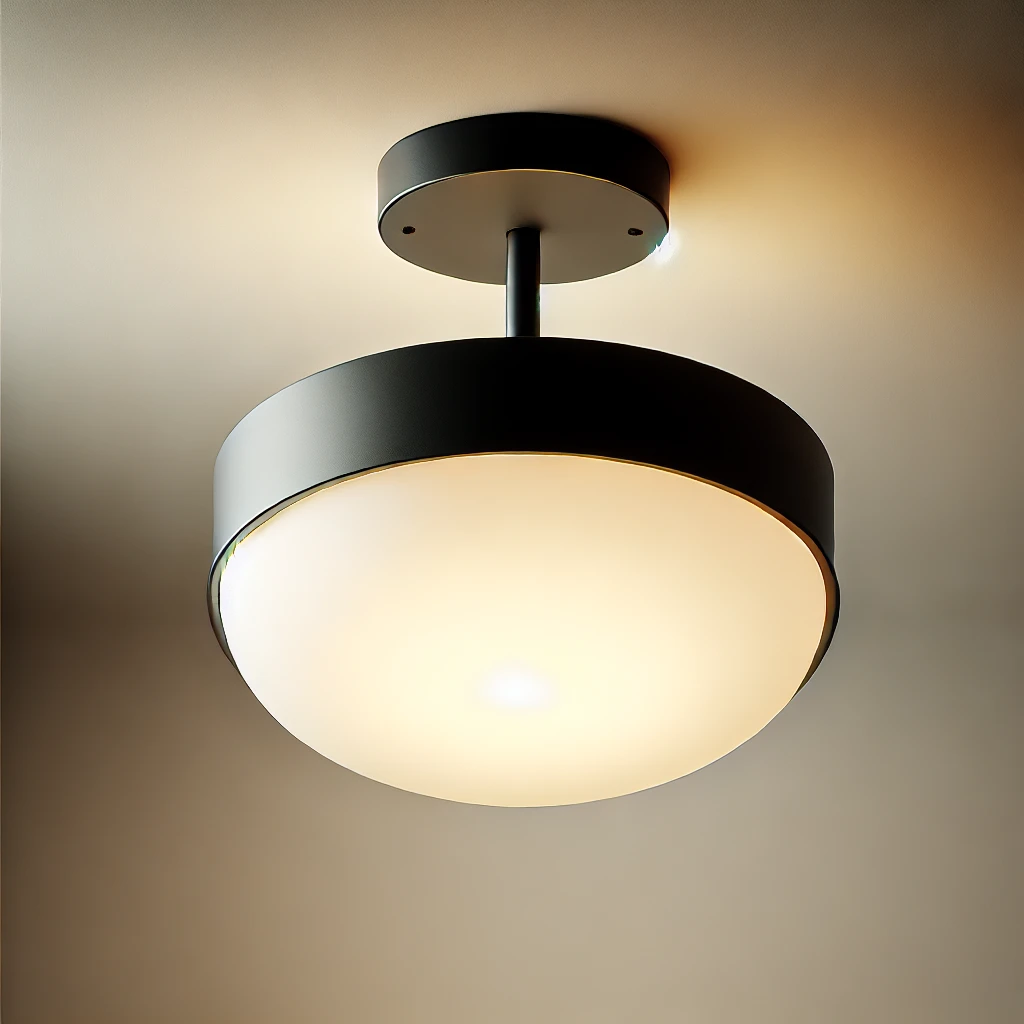 Lámpara de techo minimalista con base circular negra mate y pantalla de vidrio esmerilado, perfecta para iluminación ambiental.